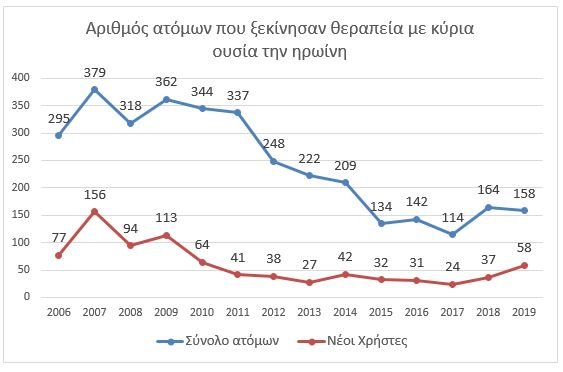 Ταυτόχρονα, παρά τη γενική μείωση στον αριθμό των ατόμων που καταγράφονται στη θεραπεία λόγω χρήσης ηρωίνης, όπως φαίνεται στο πιο κάτω γράφημα, παρατηρείται μια αύξηση κατά το έτος 2019 στον αριθμό των «νέων χρηστών» ηρωίνης, αυτών δηλαδή που ζήτησαν βοήθεια για πρώτη φορά στη ζωή τους, κατά το συγκεκριμένο έτος.