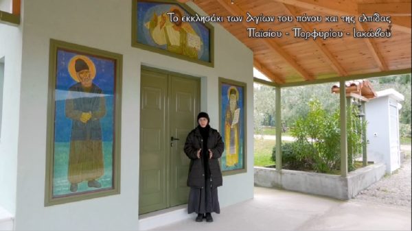 Στις 18:05 η Γερόντισσα Φιλοθέη, Ηγουμένη του Ιερού Ησυχαστηρίου Παναγίας Βρυούλων μας ξεναγεί στο παρεκκλήσι της Μονής, το οποίο είναι αφιερωμένο στους τρεις Αγίους του πόνου και της ελπίδας Παΐσιο, Πορφύριο και Ιάκωβο.