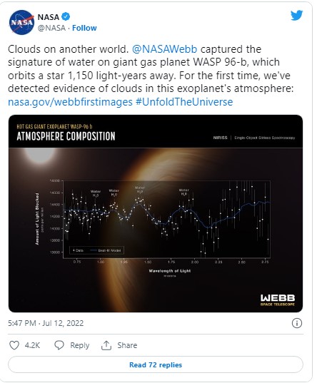 Η πρώτη εικόνα που έδωσε στη δημοσιότητα η NASA είναι η παρακάτω και παρουσιάζει μια ανάλυση της ατμόσφαιρας ενός γιγάντιου πλανήτη, του WASP-96 b. Πρόκειται για την πρώτη ανάλυση του φάσματος της ατμόσφαιρας ενός εξωπλανήτη.