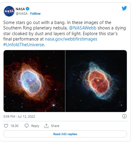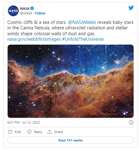 Με ανοιχτό το στόμα ο πλανήτης παρακολούθησε την παρουσίαση της NASA, σε απευθείας μετάδοση που διήρκεσε μία ώρα και στην οποία οι φωτογραφίες παρουσιαστήκαν διαδοχικά. Είδαμε διάφορες «άκρες» του Σύμπαντος, με συγκλονιστική λεπτομέρεια και εντυπωσιακά χρώματα: δύο νεφελώματα που ρίχνουν «φως» στον κύκλο ζωής των άστρων, έναν εξωπλανήτη και μια συστοιχία γαλαξιών.