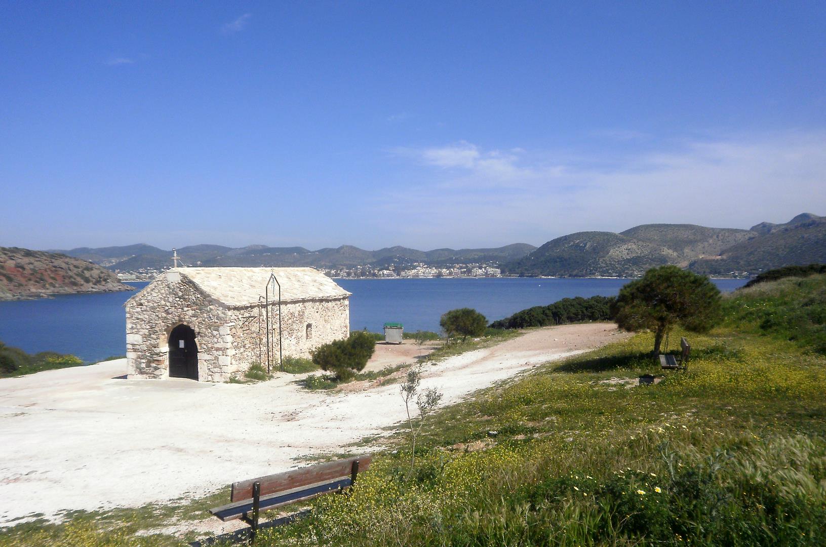 Η ονομασία της παραλίας οφείλεται στο εκκλησάκι του Αγίου Νικολάου που δεσπόζει στον λοφίσκο άνωθέν της, εξασφαλίζοντας υπέροχη θέα. Photo: Δήμος Σαρωνικού