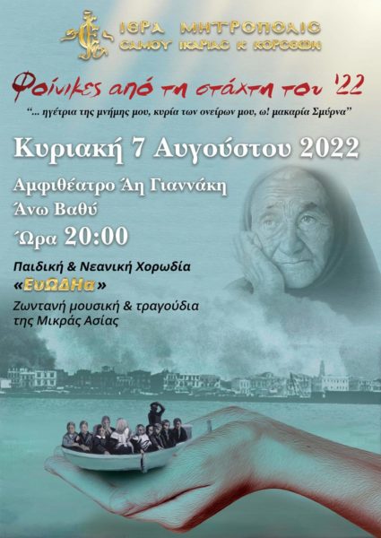 Η Ιερά Μητρόπολη Σάμου και Ικαρίας σας προσκαλεί στην Πολιτιστική Εκδήλωση Μνήμης, αφιερωμένη στα 100 χρόνια από τη Μικρασιατική Καταστροφή, με τίτλο: «Φοίνικες από τη στάχτη του ‘22».