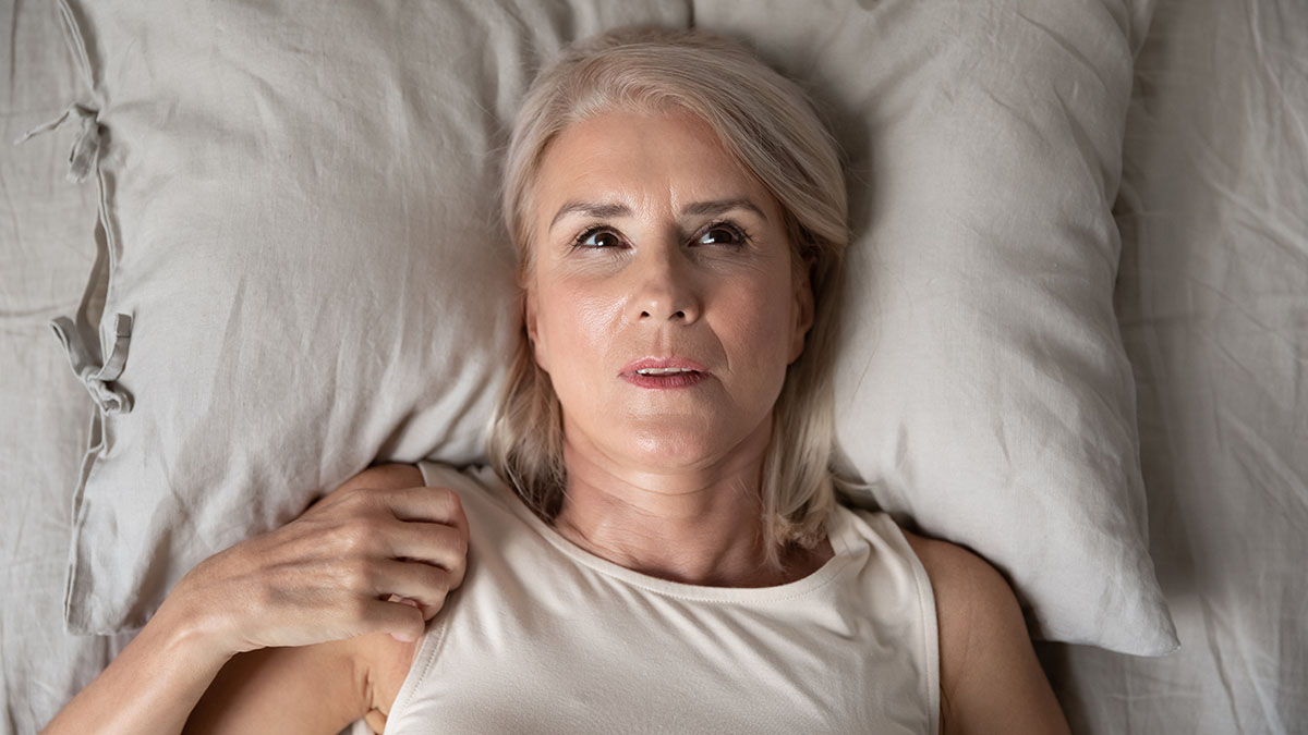 Middle aged mature woman insomniac lying awake in bed looking up trying to sleep, unhappy old senior lady feel disturbed frustrated suffer from insomnia concept uncomfortable bad mattress, top view