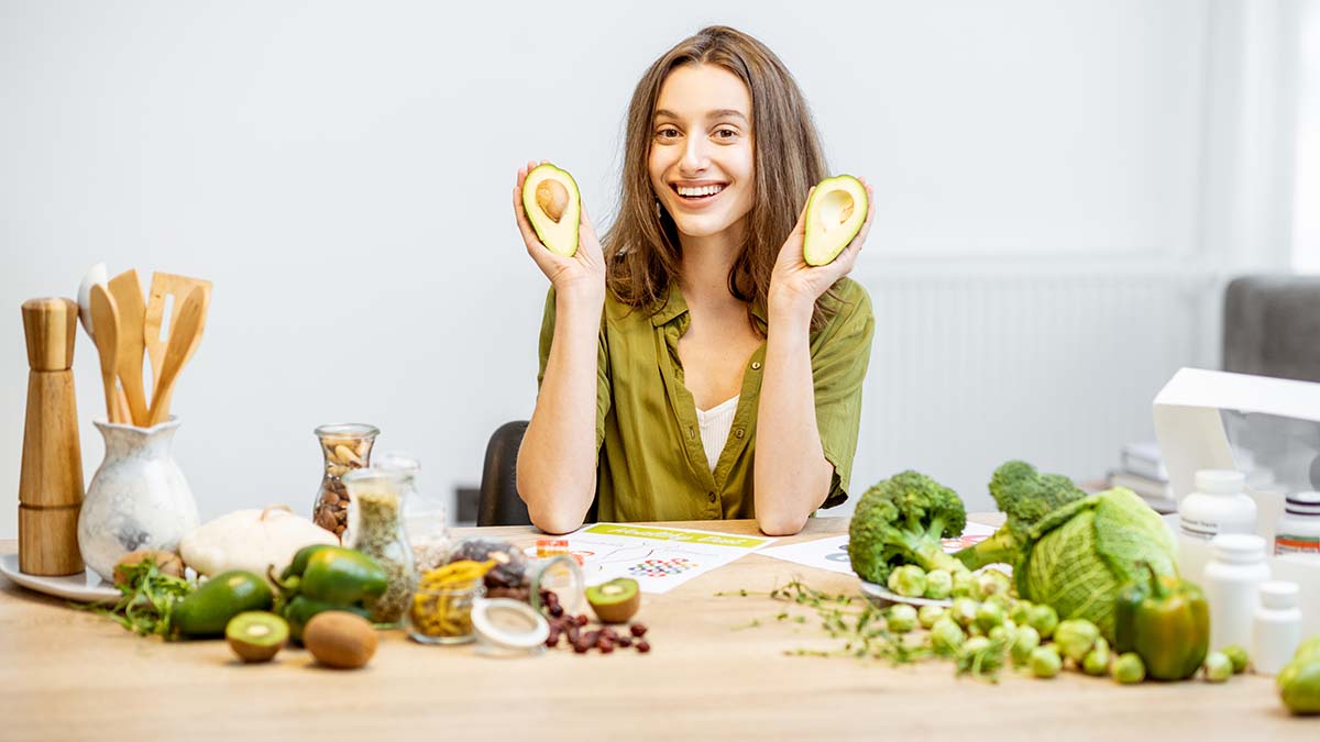 Portrait of a young cheerful woman with sliced avocado and lots of healthy green food on the table. Concept of vegetarianism and well-being