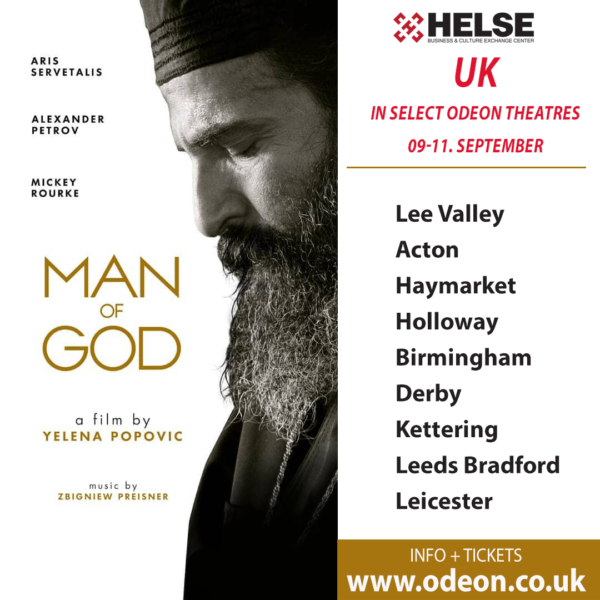 London, August 24th 2022 – “Man of God”, the award-winning box office hit that depicts the inspiring life of the widely venerated Greek Orthodox saint, Saint Nektarios of Aegina, written and directed by Yelena Popovic starring Hellenic Academy Award winner Aris Servetalis (“The Waiter”), Alexander Petrov (Luc Besson’s “Anna”) and Golden Globe winner Mickey Rourke (“The Wrestler”) releases across the UK exclusively in select Odeon cinemas on September 9th, 10th and 11th 2022 only.