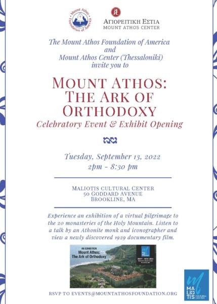 Η Αγιορειτική Εστία Θεσσαλονίκης σε συνεργασία με το Mount Athos Foundation of America παρουσιάζουν στην Αμερική την εκδήλωση με τίτλο «Άγιον Όρος. Η κιβωτός της Ορθοδοξίας».