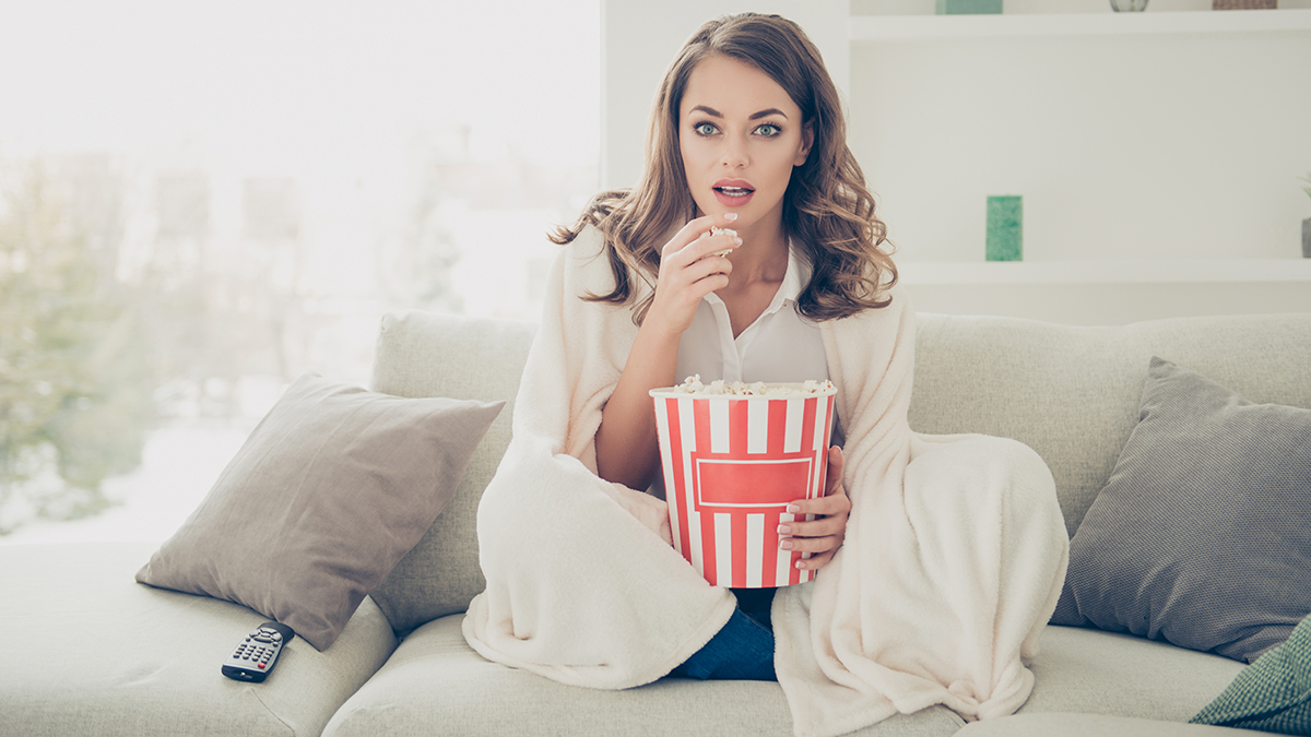 Portrait of pretty, charming, cheerful, trendy house wife with curly hair cover with coverlet having pop corn in hands watching interesting serial having comfort sitting in living room