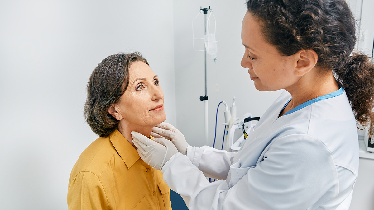 Doctor palpates of mature woman’s neck for diagnostics of thyroid diseases and hypothyroidism at medical clinic. Thyroid treatment