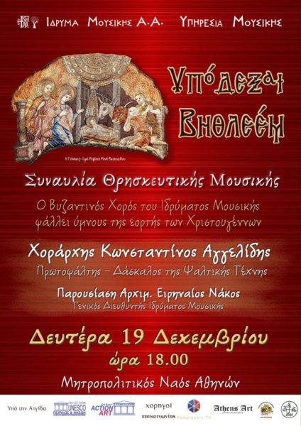 Το Ιδρυμα Μουσικής Ιεράς Αρχιεπισκοπής Αθηνών, διοργανώνει Εκδήλωση εκκλησιαστικής μουσικής με τίτλο: “ΥΠΟΔΕΞΑΙ ΒΗΘΛΕΕΜ” στον Καθεδρικό Ναό Αθηνών, την Δευτέρα 19 Δεκεμβρίου και ώρα 18.00.