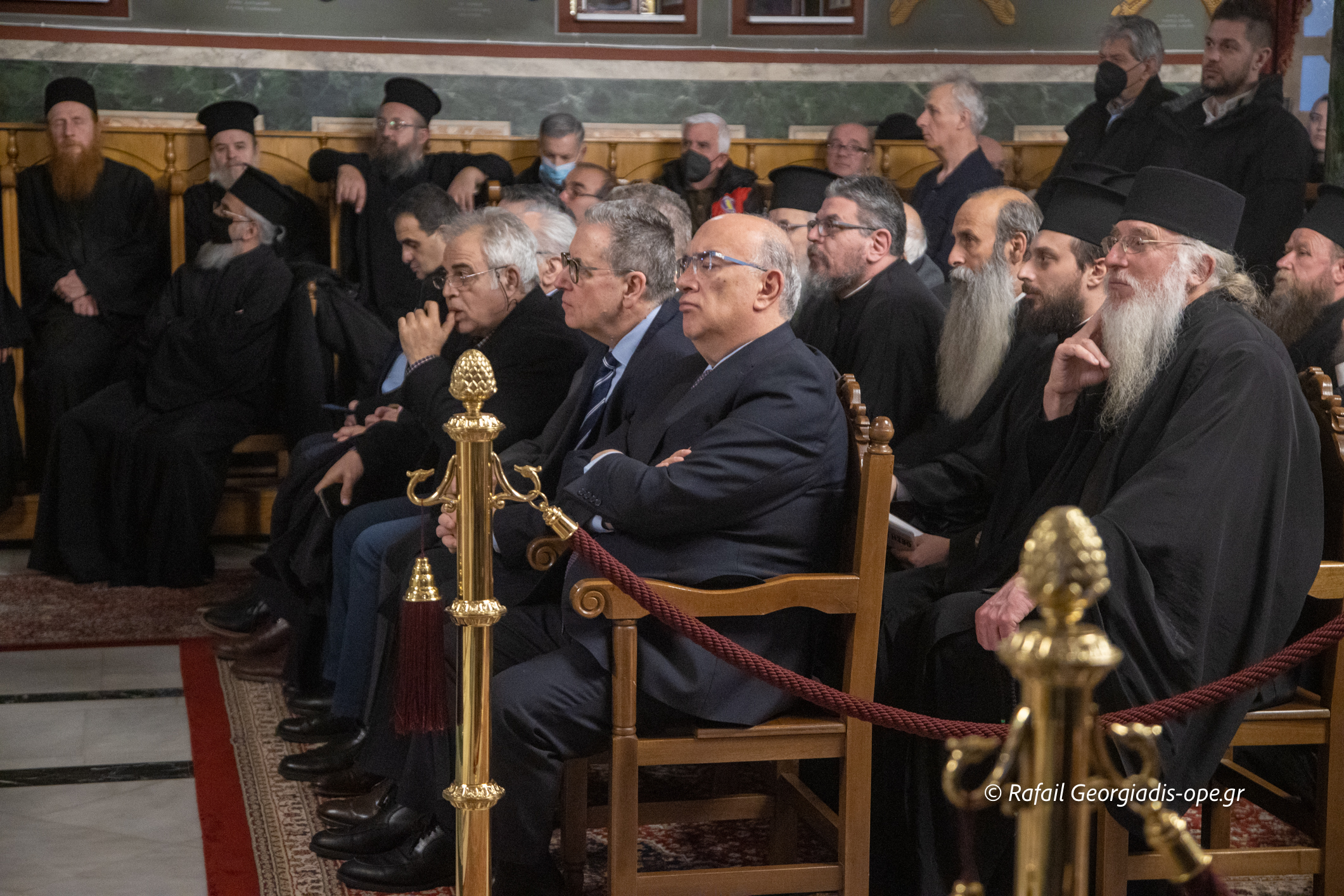«Άγιε Καθηγούμενε δύο χρόνια με την πανδημία στερηθήκαμε αυτήν την ημέρα, αυτό που κάναμε κάθε χρόνο αυτήν την εποχή, να κόβουμε μια πίτα, να έχουμε έναν ομιλητή, να ακούμε τα κάλαντα, να χαίρεται ο λαός μας», είπε απευθυνόμενος στο Γέροντα Εφραίμ και συνέχισε «Σήμερα με την χάρη της Παναγίας μας, του Αγίου Νικολάου, του Τίμιου Σταυρού, είμαστε και πάλι εδώ και χαιρόμαστε που σας έχουμε μαζί μας».