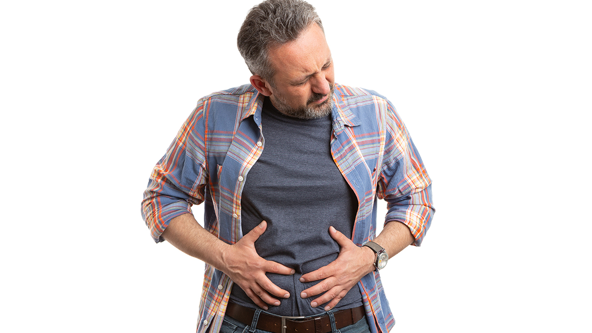Bloated man touching painful abdomen as stomach health issue concept isolated on white studio background