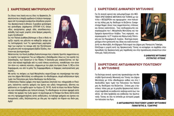 Για δεύτερη συνεχή χρονιά διοργανώνεται το Φεστιβάλ Χριστιανικής Μουσικής και Τέχνης του Δήμου Μυτιλήνης με τίτλο «Θεοδώρεια» καθώς και οι Ιερές Ακολουθίες προς τιμήν του Πολιούχου του Νησιού Αγίου Θεοδώρου του Βυζαντίου.