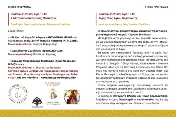 Συμμετέχουν: α) η Βυζαντινή Χορωδία Αθηνών «ΑΝΤΙΦΩΝΙΚΟ ΜΕΛΟΣ» σε σύμπραξη με τη Βυζαντινή χορωδία Λέσβου η «ΑΓΙΑ ΣΙΩΝ».Μουσική διεύθυνση: Γιώργος Καμαριάρης, η Χορωδία του Συνδέσμου Ιεροψαλτών Χίου Μουσική ΔιεύθυνσηΓαννιάρης Κώστας και η χορωδία μητροπόλεως Μυτιλήνης «Άγιος Θεόδωρος Ο Βυζάντιος» Μουσική διεύθυνση: π. Ευστράτιος Γιουσμάς.