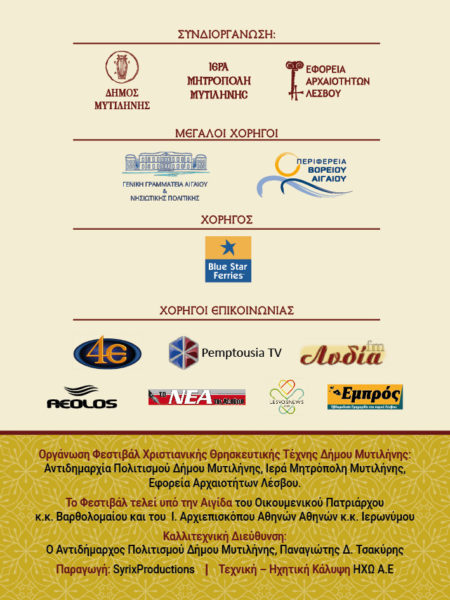 Φεστιβάλ Χριστιανικής Θρησκευτικής Τέχνης Δήμου Μυτιλήνης: Αντιδημαρχία Πολιτισμού Δήμου Μυτιλήνης, Ιερά Μητρόπολη Μυτιλήνης, Εφορεία Αρχαιοτήτων Λέσβου.