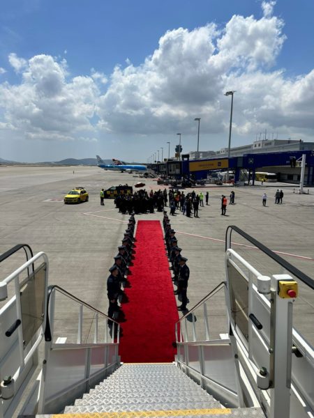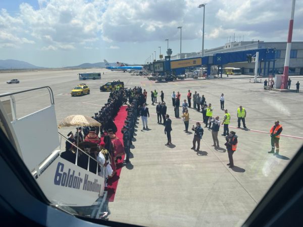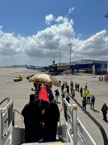 Έφτασε λίγο πριν τις 2:00 το μεσημέρι στον Διεθνή Αερολιμένα Αθηνών «Ελευθέριος Βενιζέλος» η Ιερά Εικόνα της Παναγίας «Άξιον Εστί»  από το Πρωτάτο του Αγίου Όρους.