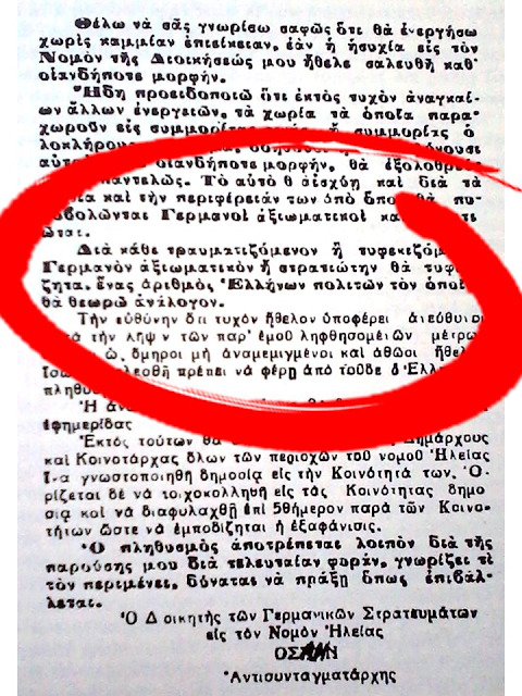 Στην περιοχή της Ηλείας έφτασε μια μεγάλη μηχανοκίνητη ομάδα Γερμανών, φοβούμενοι μήπως οι συμμαχικές δυνάμεις αποβιβαστούν στην Πελοπόννησο. Οι Γερμανοί ήρθαν αποφασισμένοι να επιβάλλουν την κυριαρχία τους. Και το έκαναν με τον πιο απάνθρωπο τρόπο. Δυο βδομάδες μετά την άφιξή τους ένας Γερμανός στρατιώτης τραυματίστηκε ελαφρά έξω από το χωριό Γεράκι. Η αντίδραση ήταν άμεση και βίαιη. Από τα 130 σπίτια του χωριού τα 127 κάηκαν μαζί με όλα τα υπάρχοντα κι ο Πρόεδρος μαζί με το Γραμματέα της κοινότητας εκτελέστηκαν. Την ίδια και χειρότερη τύχη είχαν τα χωριά Δόξα και Χώρες. Οι απανωτές θηριωδίες εις βάρος αθώων ανθρώπων έδωσε το στίγμα των όσων θα ακολουθούσαν στην ζοφερή περίοδο της Κατοχής.