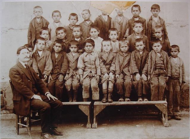 Δίβρη, 1912. Οι μαθητές μιας τάξης του Δημοτικού Σχολείου με το δάσκαλό τους κ. Σαρατσόπουλο. Στη μέση της κάτω σειράς ο Τάσης Καζάζης