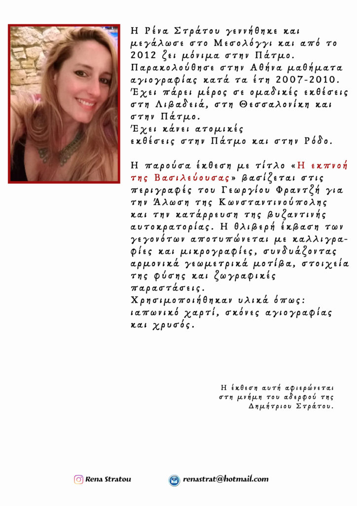 Τα εγκαίνια της ατομικής έκθεσης της Ειρήνης Στρατού με τίτλο «Η Εκπνοή της Βασιλεύουσας», θα πραγματοποιηθούν στις 28 Ιουνίου στις 19:00 στο Πολεμικό Μουσείο της Αθήνας.