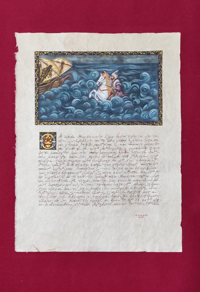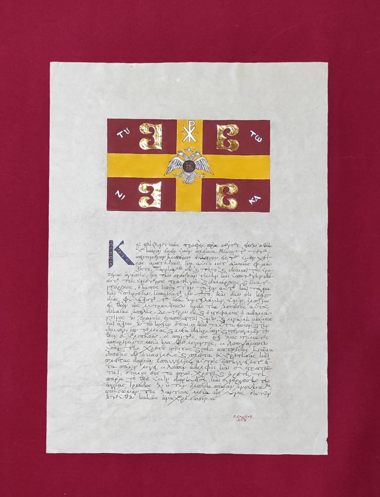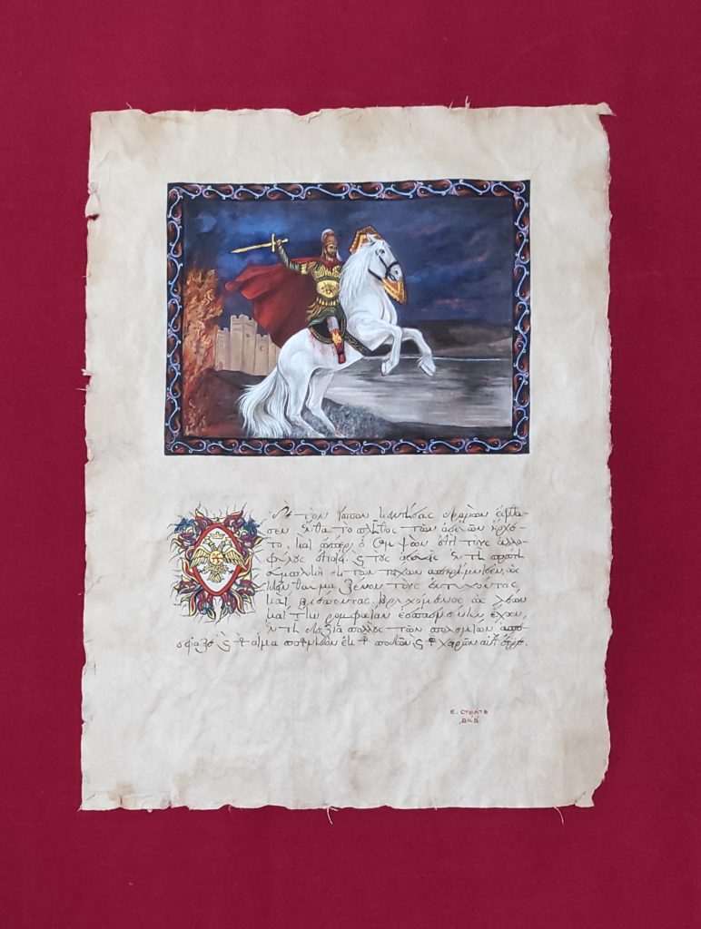 Η έκθεση βασίζεται στις περιγραφές του Γεωργίου Φραντζή για την Άλωση της Κωνσταντινούπολης και την κατάρρευση της βυζαντινής αυτοκρατορίας. Η θλιβερή έκβαση των γεγονότων αποτυπώνεται με καλλιγραφίες και μικρογραφίες, συνδυάζοντας αρμονικά γεωμετρικά μοτίβα, στοιχεία της φύσης και ζωγραφικές παραστάσεις. Χρησιμοποιήθηκαν υλικά όπως: ιαπωνικό χαρτί, σκόνες αγιογραφίας, και χρυσός.
