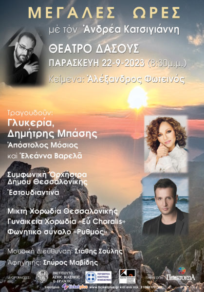 Η συναυλία «ΜΕΓΑΛΕΣ ΩΡΕΣ» του συνθέτη Ανδρέα Κατσιγιάννη μετά την μεγάλη καλλιτεχνική επιτυχία και το sold out που σημείωσε στο Ηρώδειο, θα παρουσιαστεί στη Θεσσαλονίκη την Παρασκευή 22 Σεπτεμβρίου στο Θέατρο Δάσους, με ερμηνευτές τη Γλυκερία, τον Δημήτρη Μπάση, τον Απόστολο Μόσιο και την Ελεάννα Βαρελά. Συμπράττει η Συμφωνική Ορχήστρα Δήμου Θεσσαλονίκης υπό τη διεύθυνση του μαέστρου Στάθη Σούλη. Αφηγητής ο ηθοποιός Σπύρος Μαβίδης σε κείμενα του Αλέξανδρου Φωτεινού.
