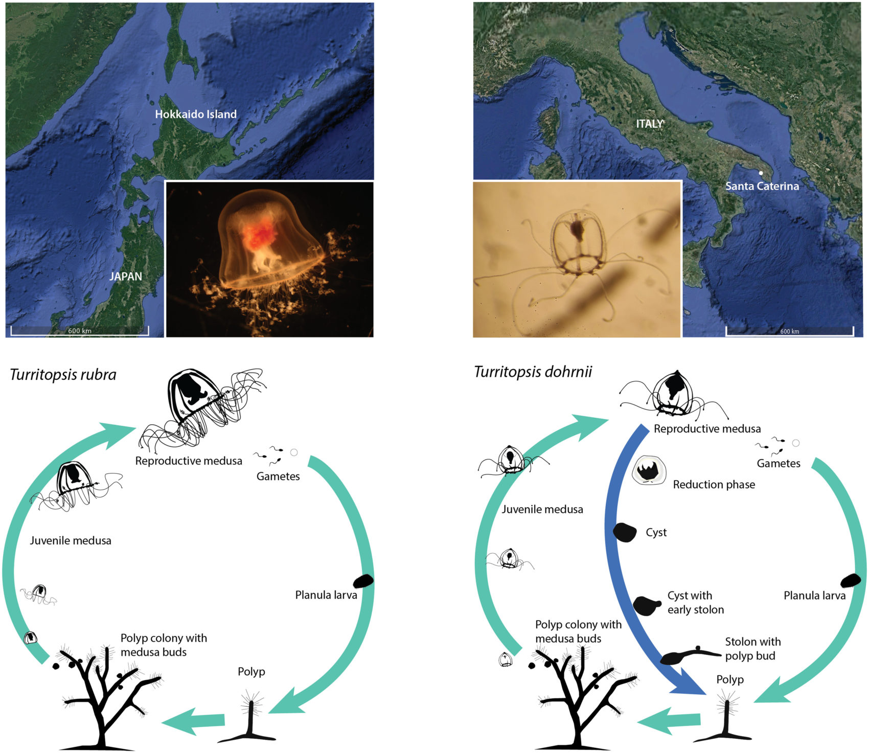 Η επιστημονική ονομασία της είναι Turritopsis dohrnii και όταν γερνάει ή τραυματίζεται, μπορεί να ξεγελάσει το θάνατο επιστρέφοντας σε μορφή πολύποδα. Αυτό το πετυχαίνει απορροφώντας τα πλοκάμια της καθώς βυθίζεται στον πυθμένα ως μία μάζα αδιαφοροποίητων κυττάρων. Από εκεί, ο πολύποδας αναπτύσσεται ξανά παράγοντας μία νέα ενήλικη μορφή, γενετικά πανομοιότυπη με την προηγούμενη.
