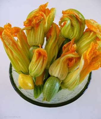 Αφαιρούμε τα κοτσανάκια από τους ανθούς, τους πλένουμε και τους αφήνουμε σε τρυπητό για να στραγγίξουν. Τσιγαρίζουμε στο λάδι τα κρεμμυδάκια και μετά ρίχνουμε τον άνηθο, τον μαϊντανό, το ρύζι και ανάλογο νερό. Ανακατεύουμε σε μέτρια φωτιά για 8 λεπτά. Κατεβάζουμε το ρύζι από τη φωτιά και ρίχνουμε λεμόνι. Γεμίζουμε τους ανθούς μ’αυτό το μείγμα ως τη μέση και τους κλείνουμε προσεκτικά, διπλώνοντας τις άκρες σταυρωτά. Τους βάζουμε σε ρηχή κατσαρόλα, προσθέτουμε λίγο λάδι, λεμόνι και λίγο νερό. Τους σιγοβράζουμε σκεπασμένους για 15 λεπτά περίπου.