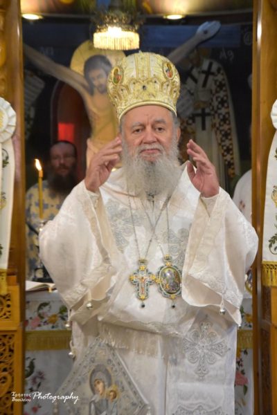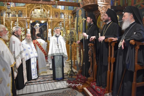 Ο Σεβασμιώτατος, εκεί, υποδέχθηκε τον Σεβασμιώτατο Μητροπολίτη Νέας Ιερσέης κ. Απόστολο και τον Θεοφιλέστατο Επίσκοπο Ωρεών κ. Φιλόθεο-Αρχιγραμματέα της Ιεράς Συνόδου της Εκκλησίας της Ελλάδος, ο οποίος χοροστάτησε στον μεγάλο πανηγυρικό Εσπερινό.