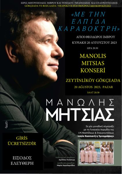 Η Ιερά Μητρόπολη Σταυρουπόλεως και Νεαπόλεως, σε συνεργασία με την Ιερά Μητρόπολη Ίμβρου και Τενέδου, διοργανώνει συναυλία με τον Μανώλη Μητσιά στην τουρκική γλώσσα, με τίτλο “Με την ελπίδα καραβοκύρη”.