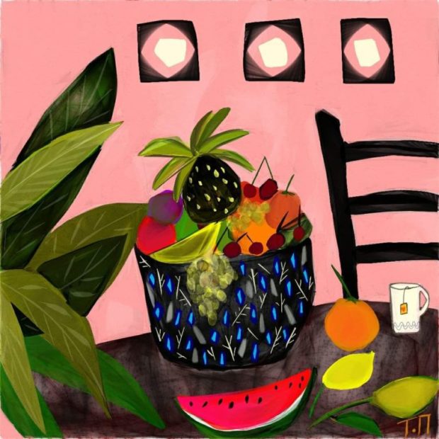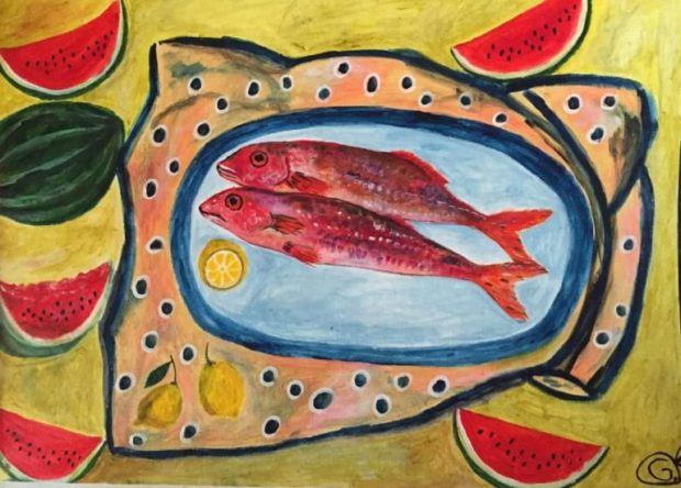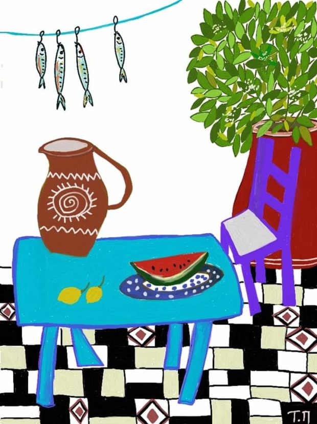 Και όλο και κάπου στα έργα της βρίσκεται κι ένα καρπούζι. Γιατί το καρπούζι γι’ αυτήν είναι πολλά περισσότερα από ένα φρούτο. Είναι τα παιδικά της καλοκαίρια, η ανεμελιά, η φροντίδα από το χέρι της γιαγιάς, η αγάπη που ένιωσε στην αρχή του δρόμου της, που ήταν τόση, έτσι ώστε να έχει αποθέματα να πορεύεται για πολλά χρόνια.