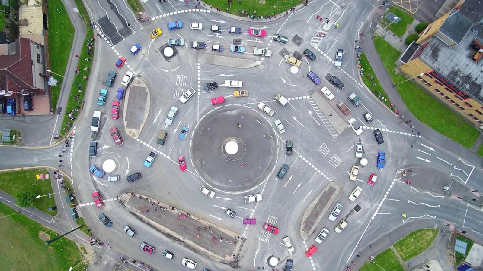 Βίντεο που έχει καταγραφεί από drone δείχνει με κάθε λεπτομέρεια την κίνηση των αυτοκινήτων μέσα στον “Magic Roundabout” (μαγικός κόσμος) ο οποίος έχει αντλήσει την ονομασία του από το ομώνυμο παιδικό τηλεοπτικό πρόγραμμα που είχε γνωρίσει τεράστια δημοφιλία τις δεκαετίες του ‘60 και του ‘70.