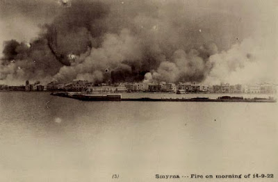 Η τελευταία εικόνα της άτυχης Σμύρνης χαράχτηκε για πάντα στη μνήμη μου: τεράστια σύννεφα καπνού να ανεβαίνουν ψηλά, ως τον ουρανό, αμέτρητα πλήθη προσφύγων να συνωστίζονται στη στενή προκυμαία και ένας πάνοπλος και παντοδύναμος πολεμικός στόλος να παρακολουθεί αμέτοχος -από πολύ κοντά- όσα συνέβαιναν.