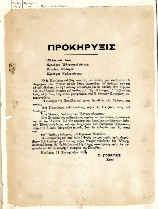 Στις 11.09.1922, οι αξιωματικοί Στ. Γονατάς και Ν. Πλαστήρας οργάνωσαν στρατιωτικό κίνημα στη Μυτιλήνη και στη Χίο, με βασικά αιτήματα την παραίτηση του Βασιλιά Κωνσταντίνου Α’, τη διάλυση της Βουλής, τον σχηματισμό νέας κυβέρνησης, η οποία θα είχε την εμπιστοσύνη της Αντάντ, την ενίσχυση του θρακικού μετώπου για την αποτροπή εισβολής των Τούρκων στην Ανατολική Θράκη και την τιμωρία των υπευθύνων της Μικρασιατικής Καταστροφής.