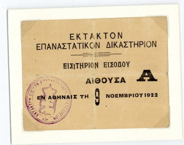 Οι επικεφαλής του επαναστατικού κινήματος που εκδηλώθηκε στη Χίο και τη Μυτιλήνη, φτάνουν στο Λαύριο στις 13.9.1922 και καταλαμβάνουν την πρωτεύουσα. Στην Ελλάδα επικρατεί χάος. Ο Βασιλιάς Κωνσταντίνος απομακρύνεται, οι υποστηρικτές του και στελέχη της κυβέρνησης συλλαμβάνονται. Μετά την ανακωχή των Μουδανιών (25.9) και την απώλεια της Ανατολικής Θράκης, η Επανάσταση κηρύσσει στρατιωτικό νόμο. Η κοινή γνώμη ζητά την παραδειγματική τιμωρία των υπευθύνων. Αποφασίζεται η παραπομπή τους σε έκτακτο στρατοδικείο και οργανώνεται Ανακριτική Επιτροπή με επικεφαλής τον Θεόδωρο Πάγκαλο. Στις 9.10.22, πάνδημο συλλαλητήριο στην Αθήνα απαιτεί «θάνατο στους προδότες». Ο κίνδυνος αιματοχυσίας είναι υπαρκτός. Το πόρισμα της Ανακριτικής Επιτροπής (24.10) παραπέμπει σε δίκη τους: