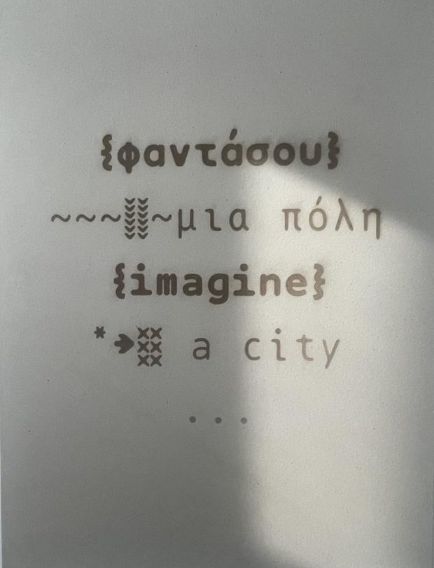 «Σε μία από τις συζητήσεις με τον Όμηρο Παναγίδη (επίκουρος καθηγητής στο Τμήμα Πολυμέσων και Γραφικών Τεχνών του ΤΕΠΑΚ και συντονιστής στο εργαστήριο Σημειωτικής & Οπτικής Επικοινωνίας), μιλούσαμε για το πώς θα διευρύνουμε την ιδέα προς τα έξω και σε όλη την κοινότητα. Τότε και τώρα στριφογυρίζουν στο μυαλό μου τα ερωτήματα: Τι είναι αυτό που ψάχνουμε και θέλουμε να έρθει το 2030 και πώς θα προσκαλέσουμε κόσμο να το δουλέψει μαζί μας; Μέσα από αυτά, φτάσαμε στο φαντάσου. Παραπέμπει κιόλας σε μία οδηγία – εντολή που χρησιμοποιείται στις εφαρμογές Τεχνητής Νοημοσύνης (AI), το ‘prompt’. Προκύπτει σε έναν διάλογο για την τεχνολογία και πώς αυτή μπορεί να μας δώσει μία πληροφορία. Ο Όμηρος έδωσε ζωή σε αυτό το ‘προ-σλόγκαν’ ή αλλιώς το αρχικό μας κάλεσμα προς την κοινότητα. Έβαλε και τις αγκύλες που παρουσιάζονται κι αυτές στην AΙ, οι οποίες όμως έχουν μία ακόμα σύνδεση. Δίνουν μια αναφορά από τα πρώτα chat rooms και το ‘miRC’, στο οποίο οι αγκύλες νοηματοδοτούσαν την αγκαλιά. Μπορεί να μην το ξέρουν όλοι, αλλά κάποιοι το θυμόμαστε. Βέβαια, και χωρίς να γνωρίζεις αυτήν την αναφορά, οι αγκύλες σηματοδοτούν πως κάτι ‘κρατάνε’, άρα δημιουργείται μια άλλη, νέα αναφορά», αναφέρει. Η Ελεάνα λέει πως είναι ένα πλαίσιο που περιμένει να παραγάγεις τις ιδέες σου αλλά και ένα παιχνίδι. «Να πούμε κιόλας ότι το ‘φαντάσου’ μπορεί να είναι ένα θετικό κάλεσμα, στην αρχή δημιουργούσε και μια πρόκληση: ‘Τι να φανταστούμε; Μπορούμε να φανταστούμε; Θα υλοποιηθούν; Έχει χώρο για την προσωπική μου άποψη;’. Μια αντίδραση που θέτει πράγματα σε ένα πλαίσιο… τώρα είναι η ευκαιρία μας. Αυτή τη στιγμή μπορεί να λειτουργεί και ως διαδικασία για εξάσκηση, για το πώς θα βρεθούμε μαζί ως συνεργάτες ή ως ετερόκλητοι φορείς που θα βάλουμε κάτω τις σκέψεις μας για τη Λεμεσό».