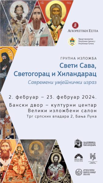 Η Αγιορειτική Εστία Θεσσαλονίκης σε συνεργασία με την Αντιπροσωπεία της Σερβικής Δημοκρατίας στην Ελλάδα, το Ίδρυμα της Μονής Χιλανδαρίου και το Πολιτιστικό Κέντρο «Banski Dvor», παρουσιάζουν στην πόλη της Μπάνια Λούκα, την ομαδική έκθεση ζωγραφικής με τίτλο «Ο Αγιορείτης Άγιος Σάββας Ο Χιλανδαρινός. Σύγχρονη εικαστική αποτύπωση».
