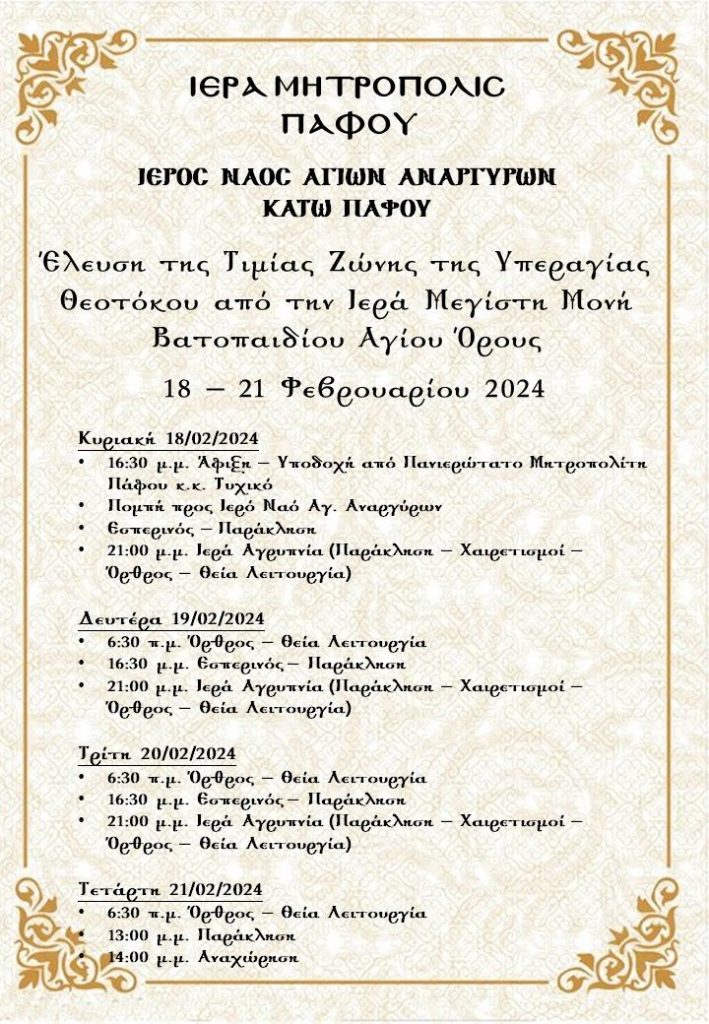 Η Τιμία Ζώνη θα τεθεί σε προσκύνημα στον Ιερό Ναό Αγίων Αναργύρων Κάτω Πάφου μέχρι και την Τετάρτη 21 Φεβρουαρίου 2024, στις 2:00 μ.μ.