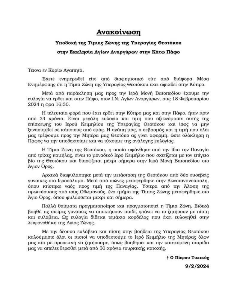 Ενόψει της έλευσης της Τιμίας Ζώνης της Υπεραγίας Θεοτόκου στον Ιερό Ναό Αγίων Αναργύρων στην Κάτω Πάφο την Κυριακή 18 Φεβρουαρίου 2024, ο Πανιερώτατος Μητροπολίτης Πάφου κ. Τυχικός απευθύνεται με ανακοίνωση του προς τον κλήρο και τον λαό, επισημαίνοντας ότι «καλούμαστε όλοι οι πιστοί να υποδεχτούμε το Ιερό Κειμήλιο της Μητέρας όλων μας και με προσευχή να ζητήσουμε, όπως βοηθήσει και την κατεχόμενη πατρίδα μας να απελευθερωθεί μετά από 50 χρόνια τουρκικής κατοχής».