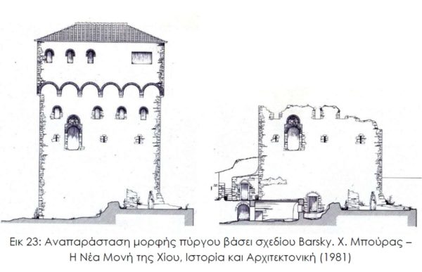 Τον 19ο αιώνα ο Πύργος απεικονίζεται χωρίς τη στέγη, ενώ σε φωτογραφίες του 1930, το κτήριο εμφανίζεται χωρίς τον τελευταίο όροφο και με σοβαρές φθορές από τον σεισμό του 1881. Από τις μαρτυρίες των πηγών είναι γνωστό ότι ο πύργος κατά τον 17ο και 18ο αιώνα, στέγαζε τη βιβλιοθήκη και το θησαυροφυλάκιο της Μονής. Από το αρχικό συγκρότημα του 11ου αιώνα, διατηρούνται σήμερα το Καθολικό, η κινστέρνα (δεξαμενή), ο πύργος, τμήμα της Τράπεζας και ο Ναός του Αγίου Λουκά στο κοιμητήριο της Μονής, εκτός του τείχους. Ο υπόλοιπος χώρος καταλαμβάνεται από άλλα κοινόχρηστα κτήρια και κυρίως από πτέρυγες κελιών, που χρονολογούνται στον 17ο, 18ο και 19ο αιώνα.