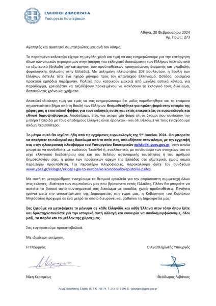 Την Επιστολή του Υπουργείου Εσωτερικών της Ελλάδας σχετικά με την επιστολική ψήφο των ομογενών μας, η οποία θα τεθεί για πρώτη φορά σε ισχύ στις Ευρωεκλογές της 9ης Ιουνίου 2024, κοινοποίησε προς τα μέλη της Ελληνορθοδόξου Κοινότητας, η Ιερά Αρχιεπισκοπή Θυατείρων και Μεγάλης Βρετανίας.