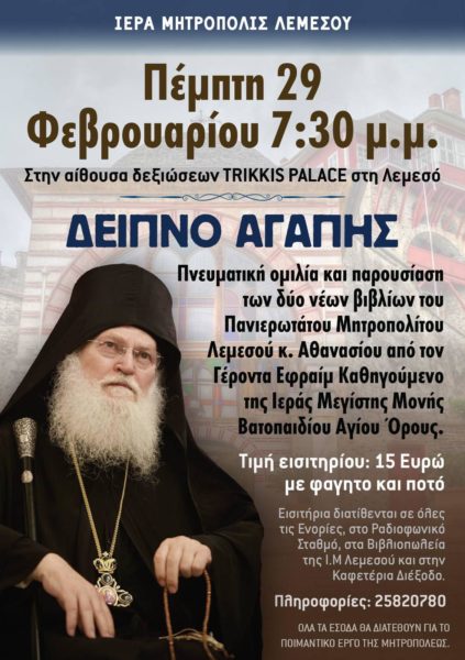 Πνευματική ομιλία θα παραχωρήσει ο Καθηγούμενος της Ιεράς Μεγίστης Μονής Βατοπαιδίου Γέροντας Εφραίμ, την Πέμπτη 29 Φεβρουαρίου 2024 στις 7:30 μ.μ., στο κέντρο Trikkis Palace απέναντι από την Ιερά Μονή Αγίου Γεωργίου του Αλαμάνου στη Λεμεσό.
