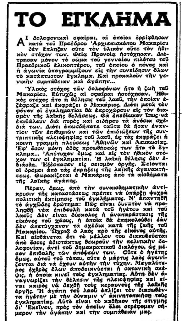 Το βράδυ της ίδιας μέρας ο Εθνάρχης τόνισε, μεταξύ άλλων, σε ραδιοτηλεοπτικό διάγγελμά του: «Αἰσθάνομαι ὀδύνην βαθυτάτην διότι εὑρέθησαν Ἕλληνες Κύπριοι, ἐνεργοῦντες αὐτοβούλως ἢ ὡς ὄργανα ἄλλων, οἱ ὁποῖοι […] ἔρριψαν ἐναντίον μου σφαίρας δολοφονικάς. Θὰ συνεχίσω τὸ ἔργον μου μὲ γνώμονα καὶ ὁδηγὸν τὸ χρέος πρὸς τὸν μάρτυρα Κυπριακὸν λαόν, ἀνταποδίδοντας ὁλοκληρωτικῶς καὶ παντοιοτρόπως τὴν ὑπὸ τοῦ λαοῦ πρὸς ἐμὲ ἐκφρασθεῖσαν μέχρι τοῦδε ἐμπιστοσύνην, μηδέποτε ὀρρωδῶν καὶ μηδέποτε λιποψυχῶν. Ὑπὲρ τοῦ λαοῦ ἐμαυτὸν τίθημι καὶ εἰς τὴν δημιουργίαν καλυτέρου δι’ αὐτὸν μέλλοντος θὰ ἀναλώσω τὴν ζωήν μου […]».