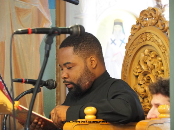 Στο δεξιό Ιερό αναλόγιο, συνδιακόνησε ο Πρωτοψάλτης της Ιεράς Μητροπόλεως Κανάγκα κ. Συμεών, ο οποίος διάβασε τον ” Απόστολο”, σε άπταιστα Ελληνικά!