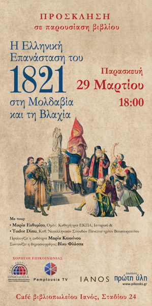 Το βιβλίο «Η Ελληνική Επανάσταση του 1821 στη Μολδαβία και τη Βλαχία» (εκδόσεις Ακρίτας)  του Καθηγητή του Πανεπιστημίου Βουκουρεστίου Tudor Dinu θα παρουσιαστεί στις 29 Μαρτίου στις 18:00, στο café του βιβλιοπωλείου Ιανός. Χορηγός επικοινωνίας είναι το Ινστιτούτο Άγιος Μάξιμος ο Γραικός.