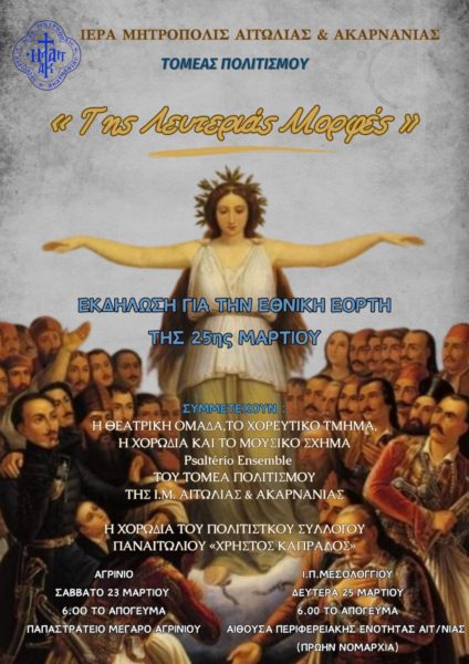 Η Ιερά Μητρόπολη Αιτωλίας και Ακαρνανίας, τιμώντας την επέτειο της Ελληνικής Επαναστάσεως του 1821, διοργανώνει επετειακή εκδήλωση με τίτλο: «Της Λευτεριάς Μορφές».