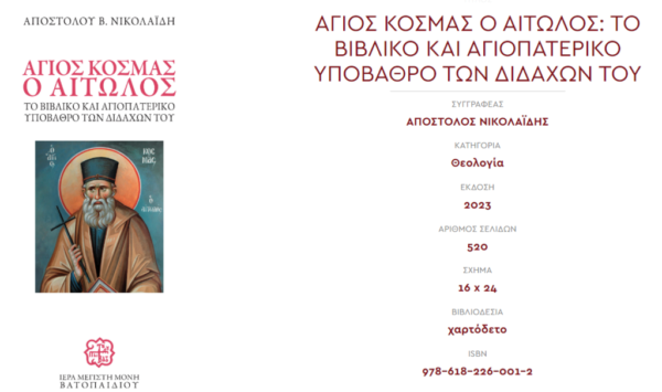 Κυκλοφορεί από τις εκδόσεις της Ιεράς Μεγίστης Μονής Βατοπαιδίου, στην κατηγορία Θεολογία, το βιβλίο “Άγιος Κοσμάς ο Αιτωλός: Το βιβλικό και αγιοπατερικό υπόβαθρο των διδαχών του”, του καθηγητή Απόστολου Νικολαΐδη.