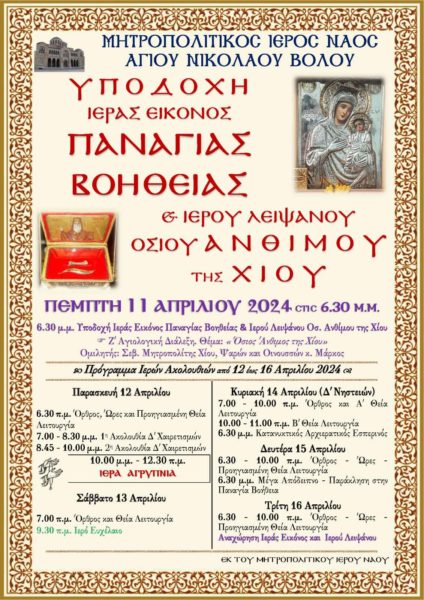 Ξεχωριστή τιμή και ευλογία για την Τοπική Εκκλησία συνιστά η έλευση και η ολιγοήμερη παραμονή στην πόλη του Βόλου της Ιεράς και Θαυματουργού Εικόνος της Παναγίας Βοηθείας και του Ιερού Λειψάνου του νεοφανούς Οσίου Ανθίμου της Χίου, που φυλάσσονται στην Ιερά Μονή Παναγίας Βοηθείας της μυροβόλου και ακριτικής νήσου Χίου.