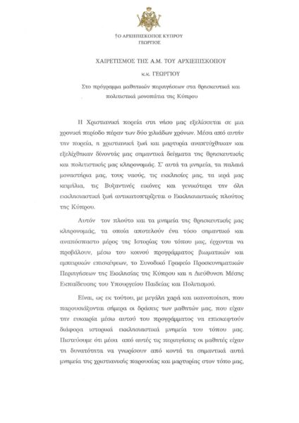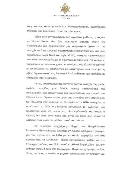 “Μέσα από την περιήγησή σας, αγαπητοί μαθητές, μπορείτε να διαπιστώσετε ότι ένα σημαντικό κομμάτι της θρησκευτικής και πολιτιστικής μας κληρονομιάς υπό κατοχής από τα τουρκικά στρατεύματα εισβολής και δεν μας είναι προσβάσιμο. Ιεροί ναοί και ιερές Μονές, ιστορικά προσκυνήματα που είναι συνυφασμένα με τη χριστιανική παρουσία στη νήσο μας, παρέμειναν για πενήντα χρόνια ασυντήρητα στο έλεος του χρόνου, με αποτέλεσμα να απειλούνται με καταστροφή, ενώ ανεκτίμητης αξίας θρησκευτικοί μας θησαυροί λεηλατήθηκαν και πωλήθηκαν παράνομα στο εξωτερικό”, ανέφερε.