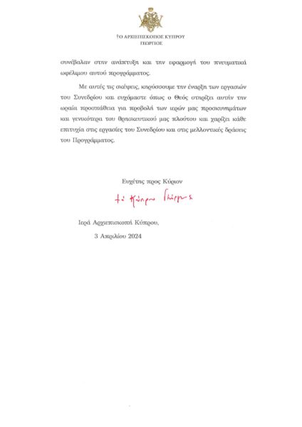 Ο Προκαθήμενος της Εκκλησίας της Κύπρου μέσα από τον χαιρετισμό υπενθύμισε προς τη μαθητιώσσα νεολαία ότι ένα σημαντικό κομμάτι αυτού του θησαυρού στον οποίο περιηγήθηκαν, δυστυχώς, βρίσκεται υπό κατοχή με σημαντικά προσκυνήματα και μνημεία να βρίσκονται υπό κατάρρευση εξαιτίας της σκόπιμης σε πολλές περιπτώσεις αδιαφορίας από τις κατοχικές δυνάμεις.