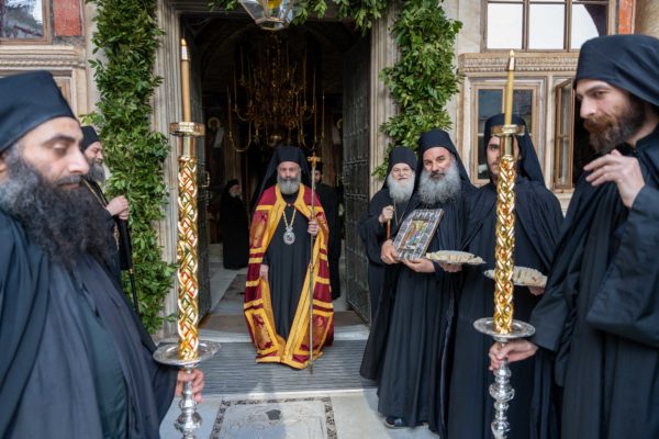 Η Ιερά Πανήγυρις ολοκληρώθηκε το απόγευμα της Κυριακής, με την τέλεση του Μεθέορτου Εσπερινού και του Κτητορικού Μνημόσυνου υπέρ αναπαύσεως των ψυχών των μακαρίων Κτητόρων της Ι.Μ.Μ. Βατοπαιδίου. Στην Ακολουθία, στην οποία προεξήρχε ο Αρχιεπίσκοπος Αυστραλίας, παρέστησαν o Σεβασμιώτατος Μητροπολίτης Νέας Κρήνης και Καλαμαριάς κ. Ιουστίνος, οι Καθηγούμενοι της Ι.Μ. Ξενοφώντος Γέρων Αλέξιος, Σταυρονικήτα Γέρων Τύχων και Παντοκράτορος Γέρων Γαβριήλ και άλλοι Αγιορείτες Πατέρες.
