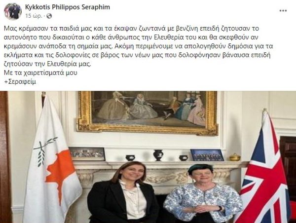 “Mας κρέμασαν τα παιδιά μας και τα έκαψαν ζωντανά με βενζίνη επειδή ζητουσαν το αυτονόητο που δικαιούται ο κάθε άνθρωπος την Ελευθερία του και θα σκεφθούν αν κρεμάσουν ανάποδα τη σημαία μας. Ακόμη περιμένουμε να απολογηθούν δημόσια για τα εκλήματα και τις δολοφονίες σε βάρος των νέων μας που δολοφόνησαν βάναυσα επειδή ζητούσαν την Ελευθερία μας. Με τα χαιρετίσματά μου”, σε ανάρτησή του ο Μητροπολίτης Ζιμπάμπουε κ. Σεραφείμ, σχολιάζοντας το γεγονός.